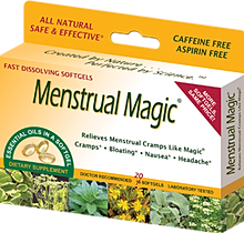 - Menstrual Magic. Dissolves within four minutes. Provides fast relief from menstrual symptoms, such as cramps, nausea, mood swings, headache, backache, and bloating. Must be taking with meals or will experience a herbal taste or burp.